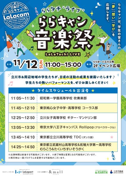 こんにちは!ギター・マンドリン部です。 11月12日(日)、ららぽーと立川立飛の「ららタチ“ライブ”ららキャン音