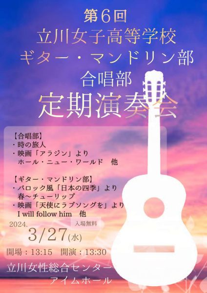 こんにちは!ギター・マンドリン部です。 11月12日(日)、ららぽーと立川立飛で演奏させていただきます。