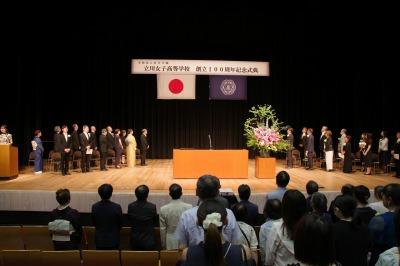 100周年を迎えた本校は、8月30日(土)13時から、たましんRISURUホールにて「創立100周年記念式典」を行いました。式典は2部構成となっており、司会は、現在声優として活躍している卒業生に務めていただきました。