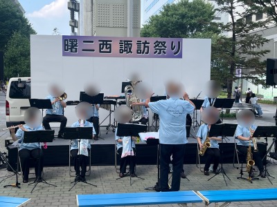 8月に府中の森芸術劇場で開催されましたコンクールに出場し、銅賞を受賞しました。また8月下旬、立川駅北口サンサンロードで行われた「曙二西諏訪祭り」で演奏させていただきました。その1週間後には、創立100周年記念式典でも演奏させていただき、卒業生の方々にも演奏に加わっていただきました。