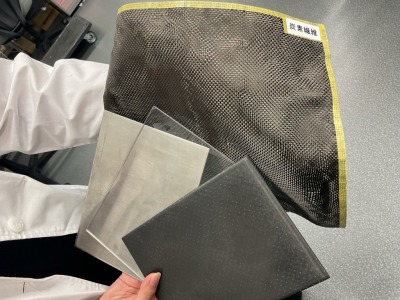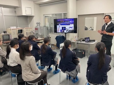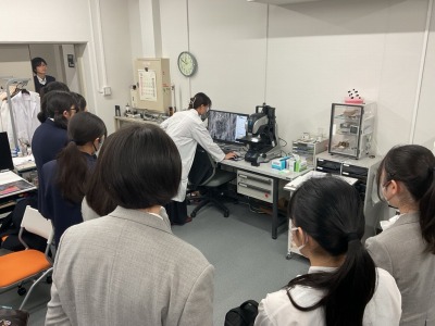 数億円の機械が設置されているとのことで、埃がつかないよう履き物にビニールを被せ研究室に入りました。材料やその組み合わせによって、強度や軽さが変化することを体験しました。