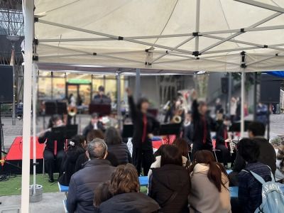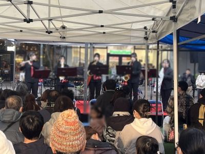 満席となるほど多数の方にご清聴いただきました。席がないため、後ろのほうで立って見てくださる方もたくさんいらっしゃいました。老若男女多くの方が足を止め、演奏を聴いてくださいました。寒空の中、少しでも皆様の心を温かくできていましたら幸いです。