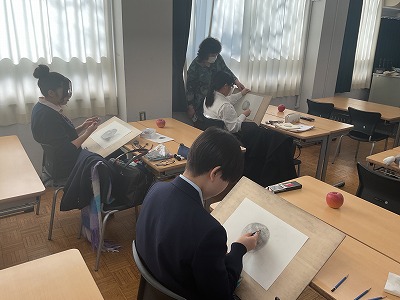 本講座では、デッサンの基礎について学んだ後、実際にりんごをモチーフにしたデッサンに取り組みました。デッサンにおいて「観察」がいかに重要であるかを教わり、生徒たちはそれぞれ手元のりんごをじっくり観察しながら描写を進めました。