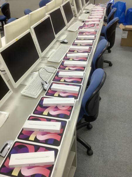 情報科の授業で活用するiPad Airが40台導入されました。 保管庫で同時にフル充電もできます。